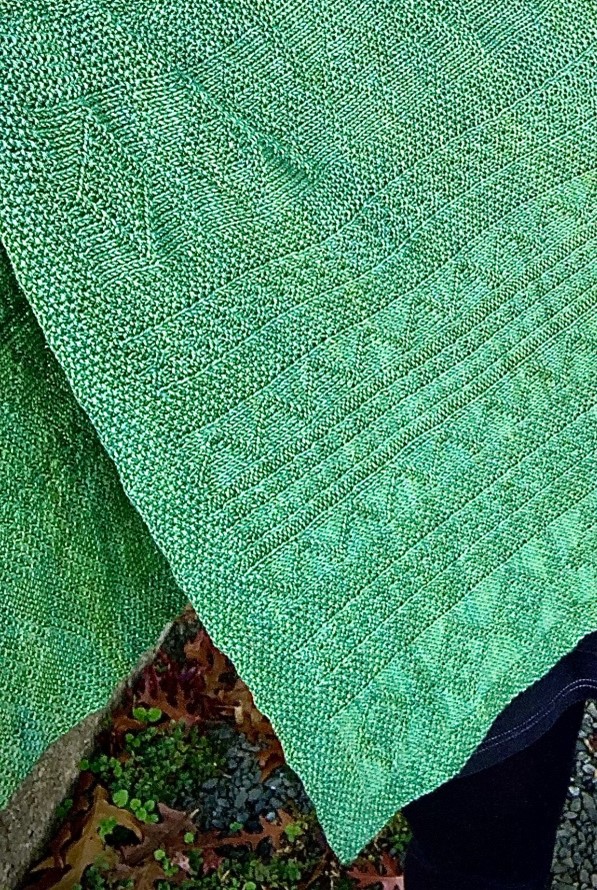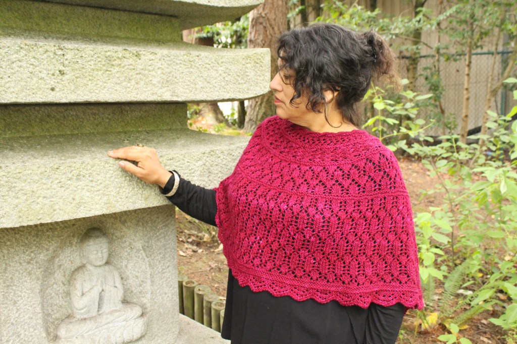 Cape Flattery, by Celia Roberts, is a knitted vision of the northwestern-most point in the contiguous United States. Knit in the round, the cape begins with a spiral edge neckline that evokes cresting waves, while the lacework reflects the fish, invertebrates, and mammals that live and play in this remote part of Washington state. The cape can be made in three sizes – neck circumference 17-26 inches (45-71 cm), using 460-920 yds (422-844 m) of DK weight yarn. Shown here in Jorstad Creek Chelan.