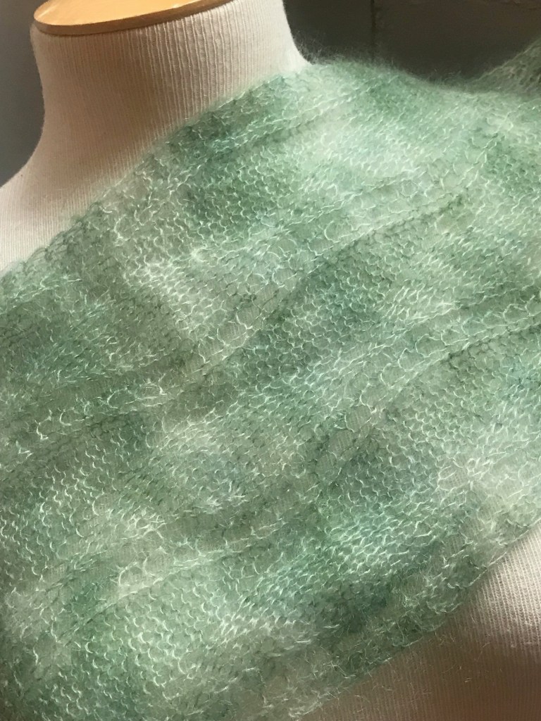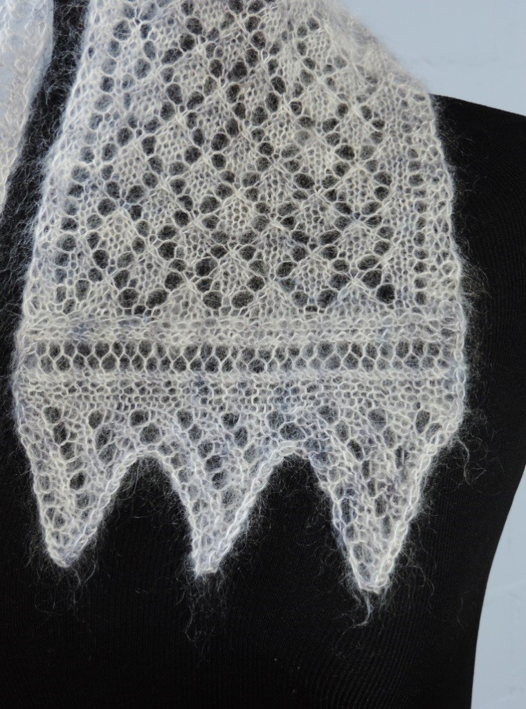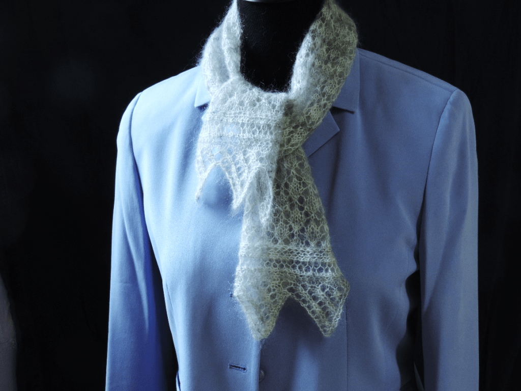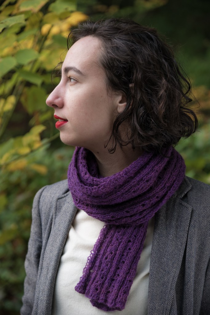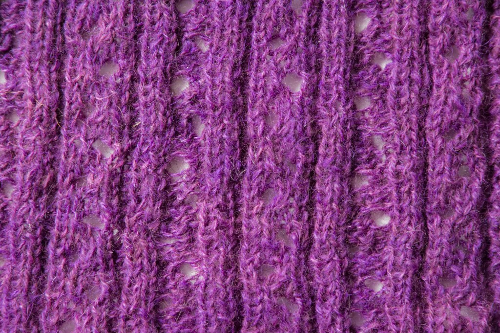 The Foot Steps Lace Scarf by Jann Hoppler was inspired by footsteps in the snow. The pattern is very simple with only three different pattern rows and is completely reversible. The ribbed lace stitch pattern will keep you warm, even on a cold snowy day. You will need 750 – 900 yards of lace weight yarn, depending on desired length. Shown here in Jorstad Creek Narfi (Purple) and Jorstad Creek Orcas (Blue) yarn, it is also beautiful in Isle of Skye.