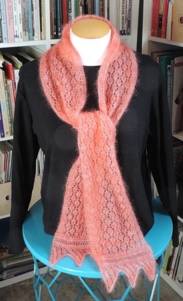 The Ebb and Flow Scarf and Shawl by Jann Hoppler has an original lace stitch which flows from knit to purl and back again; causing the fabric to come forward and then recede, reminiscent of the tide. It is totally reversible. Both the scarf and the shawl are worked flat. The scarf is approximately 9 inches wide and the shawl is about 15 inches wide. The scarf takes 400 yards of lace weight yarn; the shawl takes 800 yards. Shown in Jorstad Creek Cornwall (Lilac) and Jorstad Creek Isle of Skye (Sage).